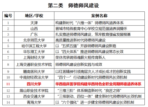 近日,由教育部教师工作司指导,中国教育报刊社牵头组织的“新时代高水平教师队伍建设创新案例(2025)”遴选结果公布,华西临床医学院(华西医院、华西护理学院、附属成都市第二人民医院)提交的《华西临床医学院构建华西特色全职业周期师德涵养体系》成功入选“师德师风建设”领域创新案例,该类别全国共14个案例入选。